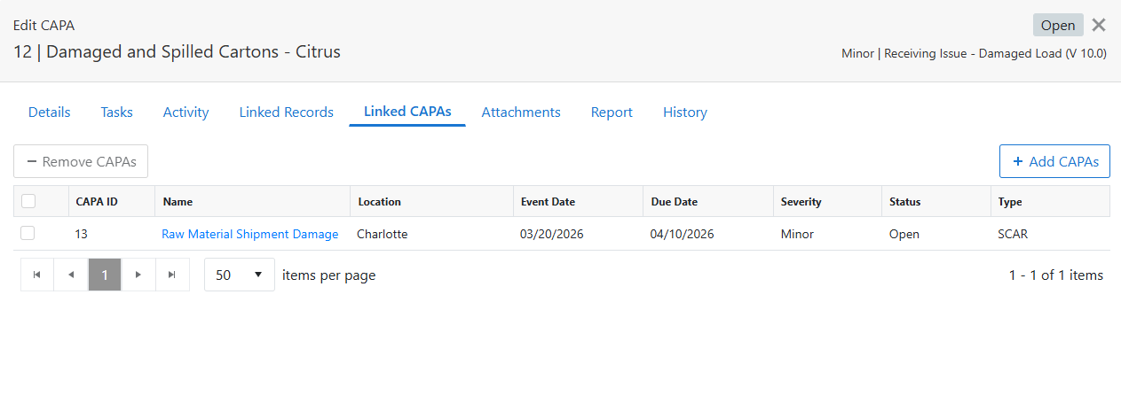 Granted: The + Add CAPAs and - Remove CAPAs buttons are enabled in the Linked CAPAs tab, allowing CAPAs to be linked and unlinked.