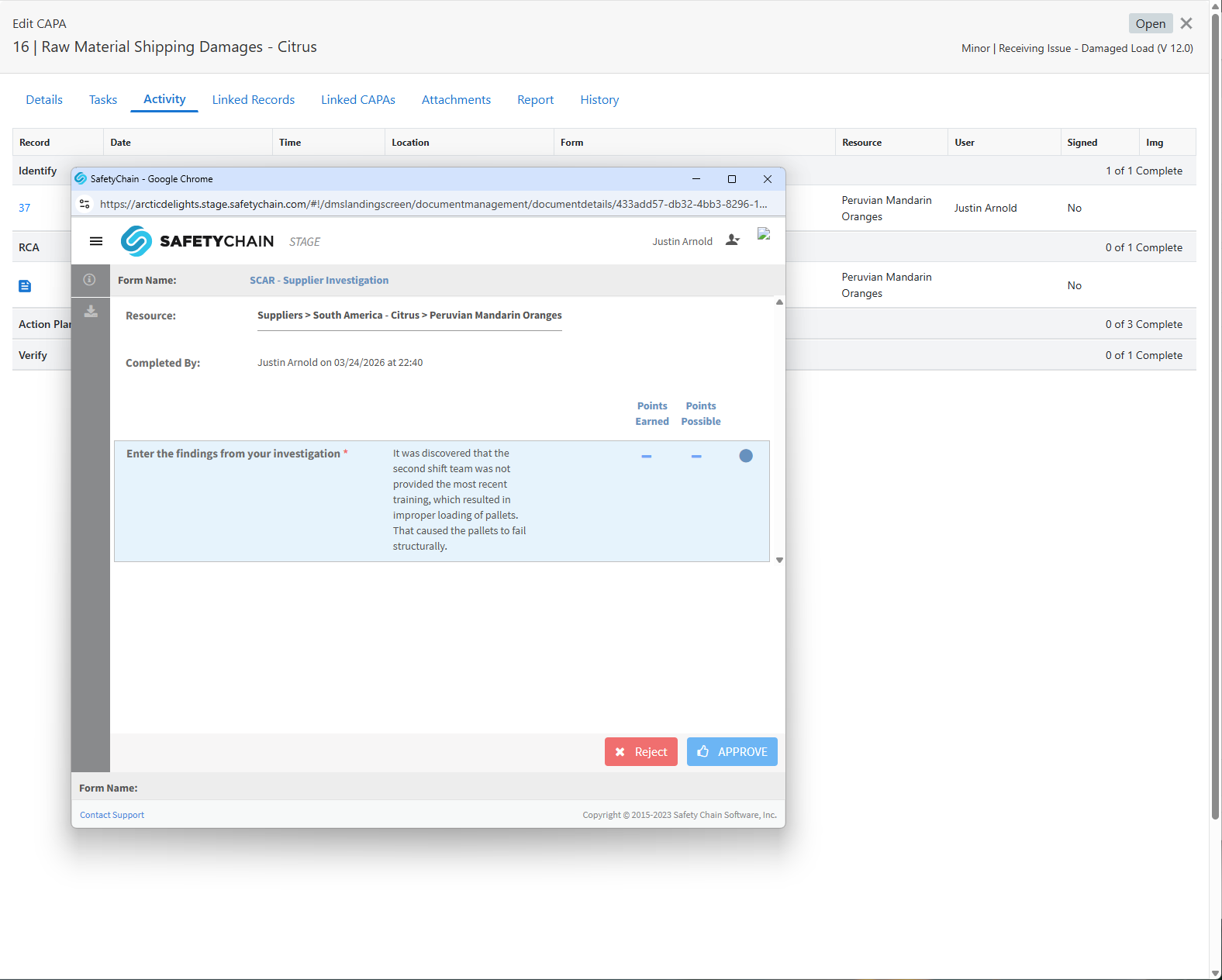 Approval and rejection workflows give internal quality teams a defined review step before any supplier submission is accepted into the record.