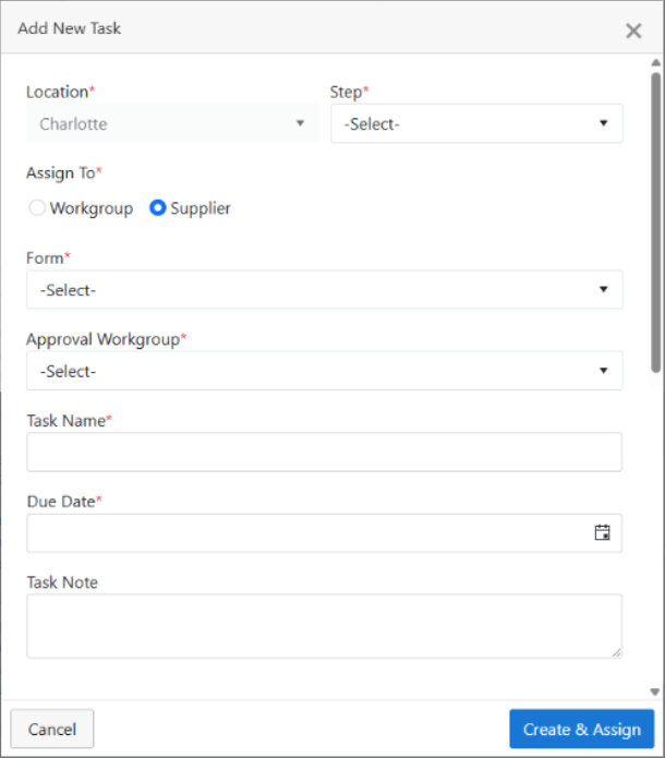 After a SCAR has been started, there are situations where new Tasks need to be sent to a supplier for ongoing SCAR activities. From the Tasks tab of the CAPA slide-out, users can now create ad hoc external Tasks. They must select the CAPA Step that the Task will belong to, choose the Form and Approval Workgroup, add a Task Name, and set the Due Date. Users can also include an optional Task Note that will be displayed in the Supplier Portal with the Task.