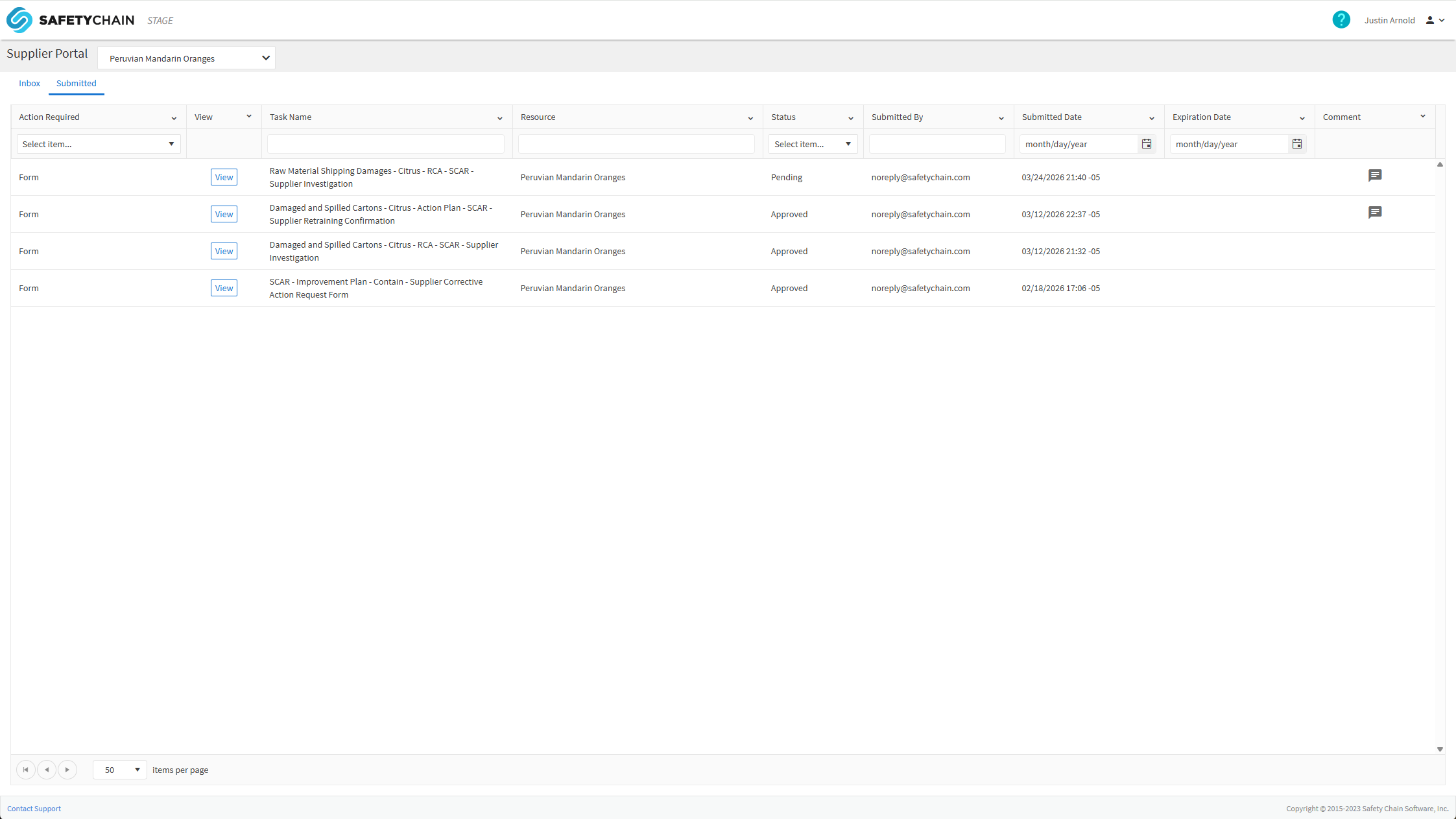 When SCAR external Tasks are enabled, the Supplier Portal > Submitted tab view changes to accommodate supplier Requirements and Corrective Actions (SCAR Tasks). To accommodate both types of submitted Tasks, we have introduced the below changes.